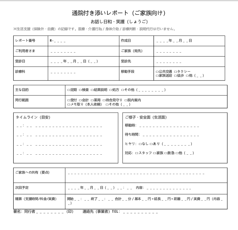 - さらに、介護福祉士が対応し、メモ取りやご家族共有もできるため、「付き添いの安心」を重視する方にも選ばれやすい形にしています。